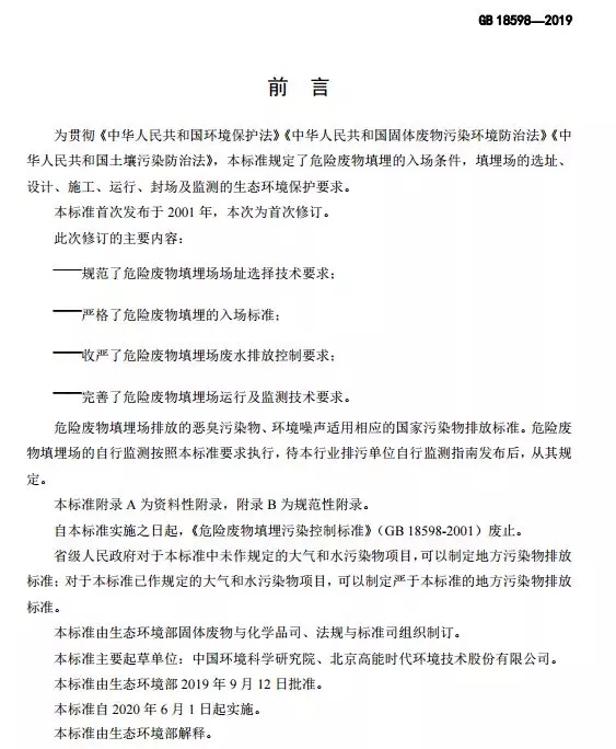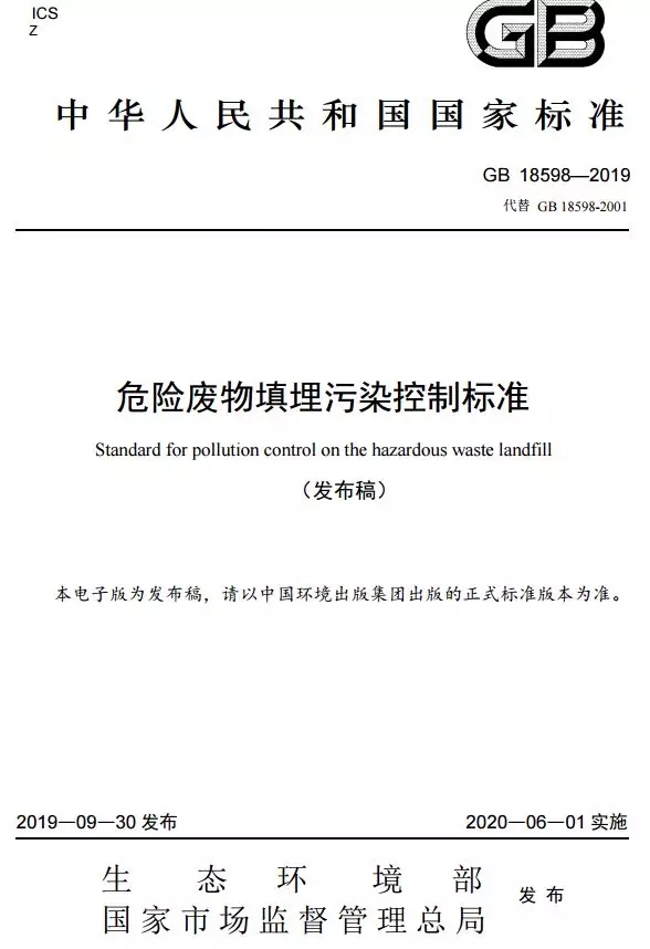 該標準自2020年6月1日起實施,自實施之日起,《危險廢物填埋污染控制標準》(GB18598-2001)同時廢止。