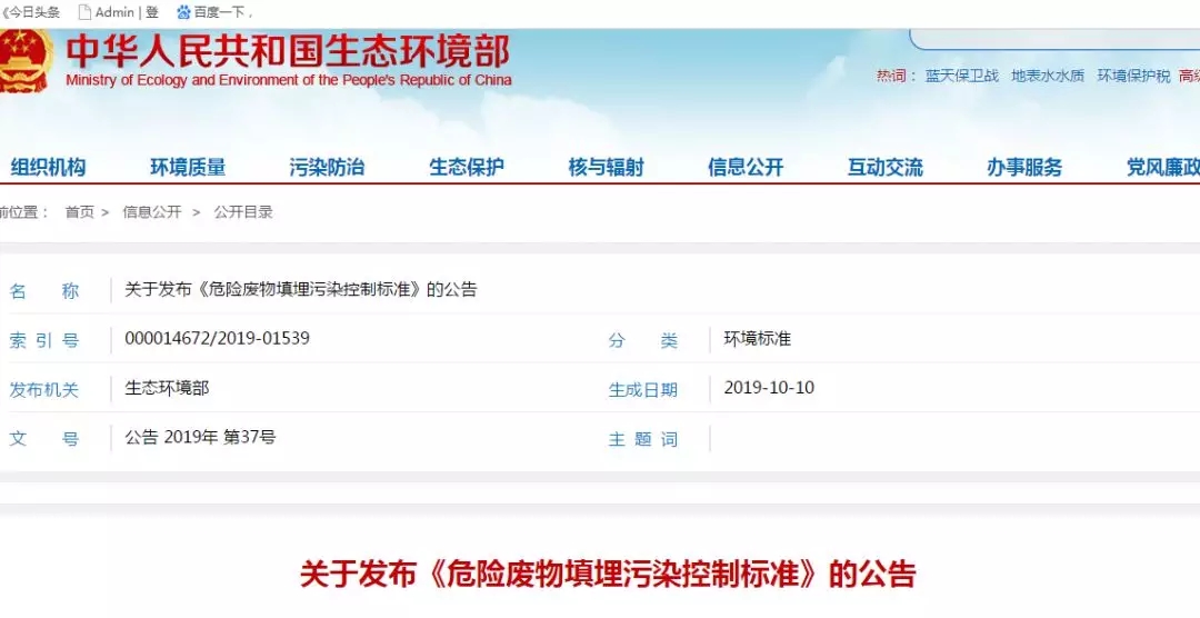 生態環境部最新發布!《危險廢物填埋污染控制標準》自2020年6月1日實施